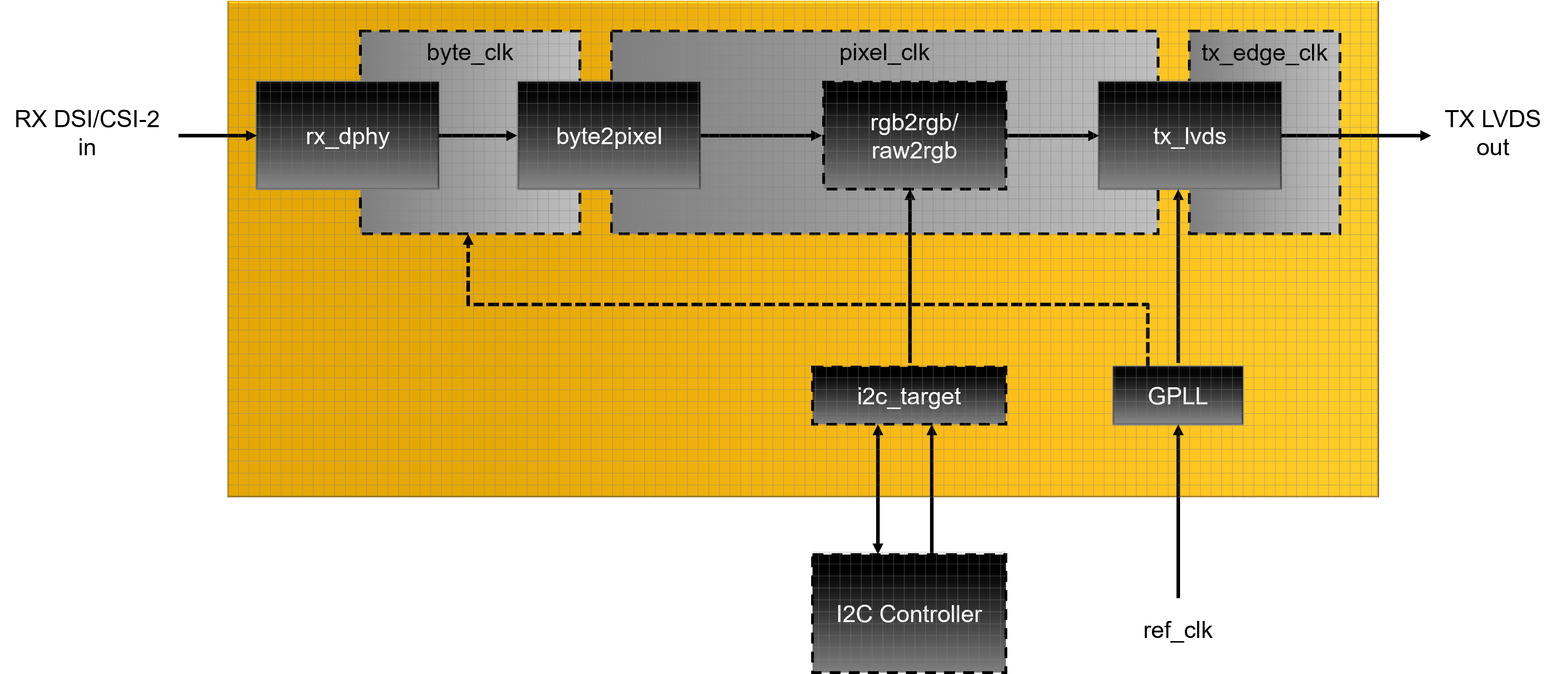Mobile Industry Processor Interface (MIPI®) Display Serial Interface (DSI) is one of the most popular display interface in the consumer market today. On the other hand, Open LVDS Display Interface (OpenLDI) low voltage differential signal (LVDS) is still popular in some areas as the main predecessor of display interface. The majority of image sensors and application processors (AP) in the consumer market use MIPI Camera Serial Interface 2 (CSI-2) as a video signal interface. In some cases, the interface and/or format conversion is useful to connect devices which cannot connect directly.