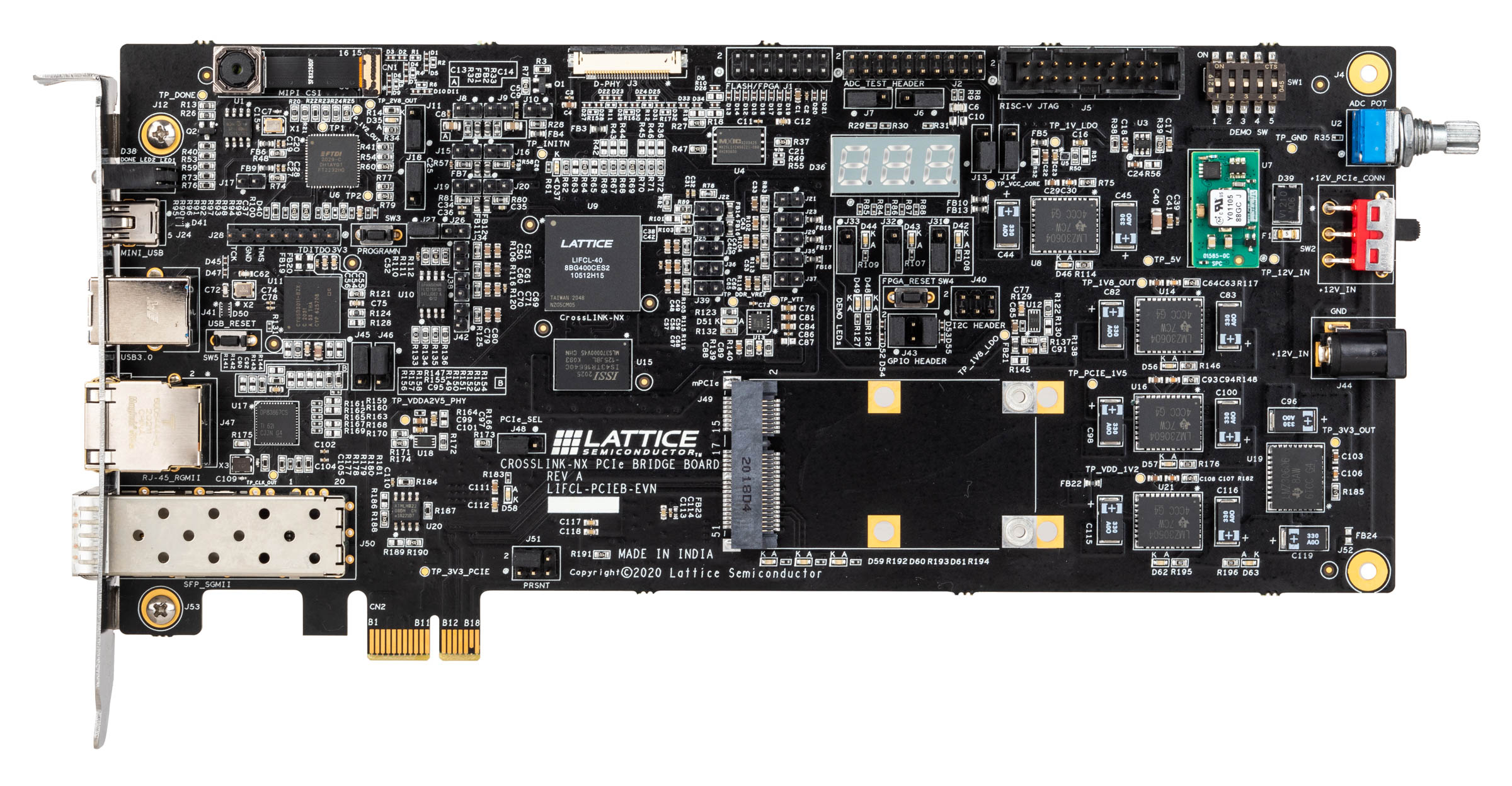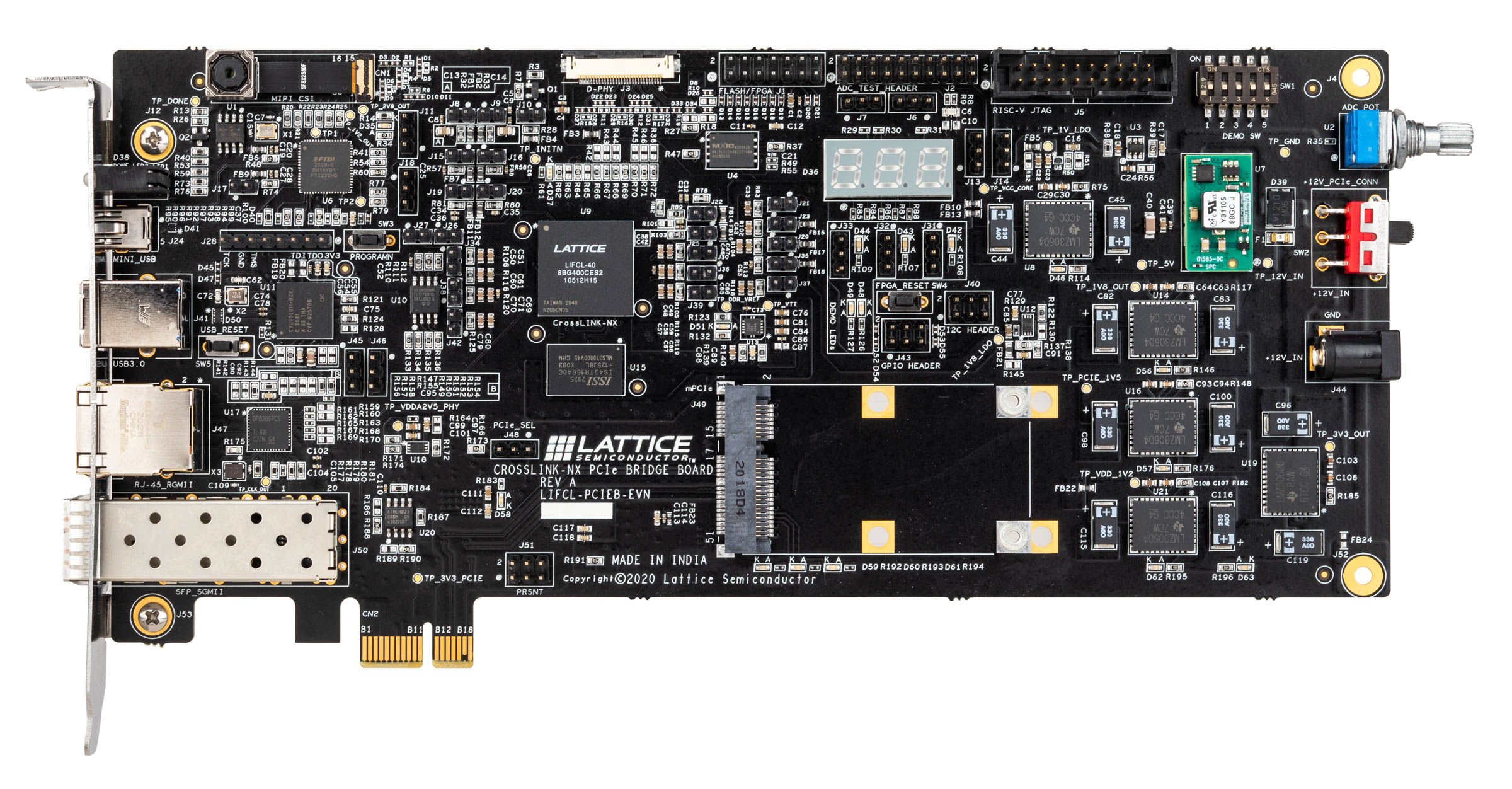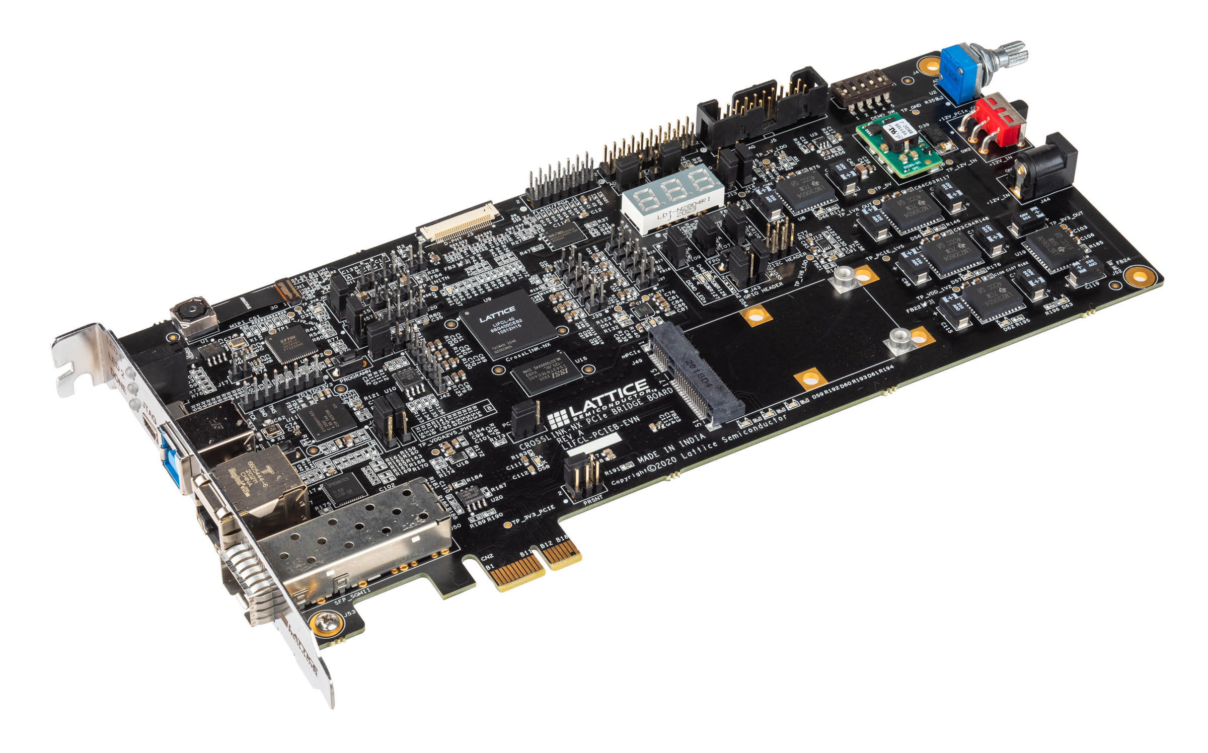 Rapid prototyping and proof-of-concept demos – Assists engineers with rapid prototyping and testing of their CrossLink-NX designs. Several demos and reference designs targeting this board are available for download from the Lattice Solutions page, to speed-up development of PCI Express, SGMII, DDR3, soft error correction (SEC) and D-PHY camera and display interface functions.