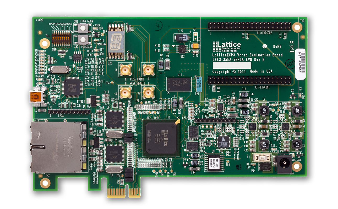 The LatticeECP3 Versa Development Kit empowers designers to build both PCI Express and Gigabit Ethernet based systems. The Kit kit offers free design tools, ready-made demos, reference designs, a versatile evaluation board, and a serial programming cable. The evaluation board features an LFE3-35EA-8FN484C FPGA device, 64 Mbit SPI Flash, 1Gbit DDR3 memory, expansion headers, several LEDs, and user switches. It contains a PCI Express x1 (half-length form-factor), two RJ45 connectors, and four SMA interfaces.