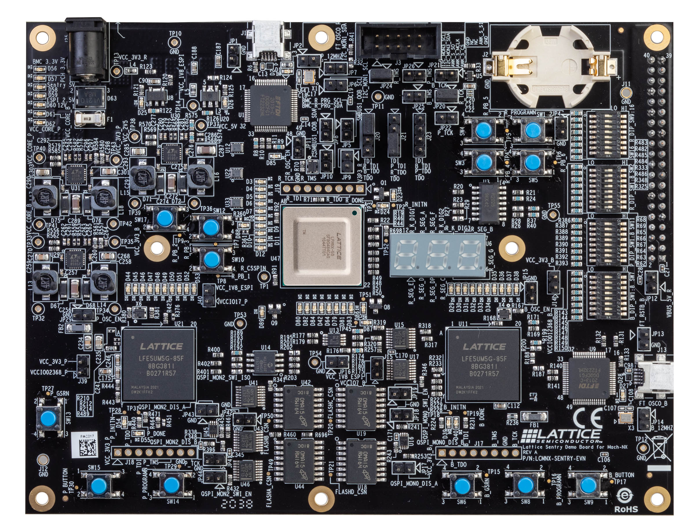 The Lattice Sentry Demo Board for Mach-NX help you develop and test a NIST SP 800-193-compliant PFR solution on a single board, using the Mach-NX as a Platform Root of Trust, and two Lattice ECP5 FPGAs which act as PFR-protected ICs in the system.