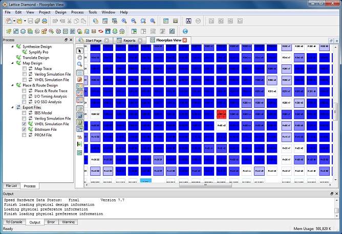 Lattice Diamondには幾つかの抽象化機能があります。フロアプラン・ビュー(Floorplan View)では配置に関する制約を表示し、また編集する機能があります。フィジカル・ビュー(Physical View)では、タイミングに関する問題のより詳細な理解のために、物理的な配線とパスの詳細を読み取り専用として表示します。ネットリスト・ビュー(Netlist View)では、制約を設定するために設計内のポートやインスタンス、およびネットの閲覧ができ、パッケージ・ビューなどの他のビューへドラッグ・アンド・ドロップできます。NCDビューでは、SLICEやPIO、そしてIOLOGICや他のエレメントなど、物理的なコンポーネントの詳細な使い方に関する情報へのアクセスができます。デバイス・ビュー(Device View)では、デバイスに特有のリソースを閲覧する機能や、他のビューにクロスプローブすることができます。これらのビューを一緒に用いることで、デザインの実装を解析して、そして制約を与えるために必要な情報を得ることができます。