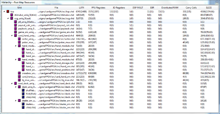 統合されているHDLコードチェック機能で、論理合成の前にデザインを解析することによって、時間を節約しましょう。プロジェクトを立ち上げると、ファイルリスト窓やプロセス窓と共にハイアラーキ・ビュー(Hierarchy View)が自動的にオープンします。論理合成後は、リソース使用数が自動的にアノテートされて階層ごとに表示されます。マッピング後も物理エレメント(スライス)数として更新されます。HDL ダイヤグラム(HDL Diagram)がツールバーやメニューから開けます。これには複数のビューがあり、論理合成前のHDLをグラフィカルに表示したり、設計に対してBKM(Best Known Methods)ルールチェックを実行したりすることができます。