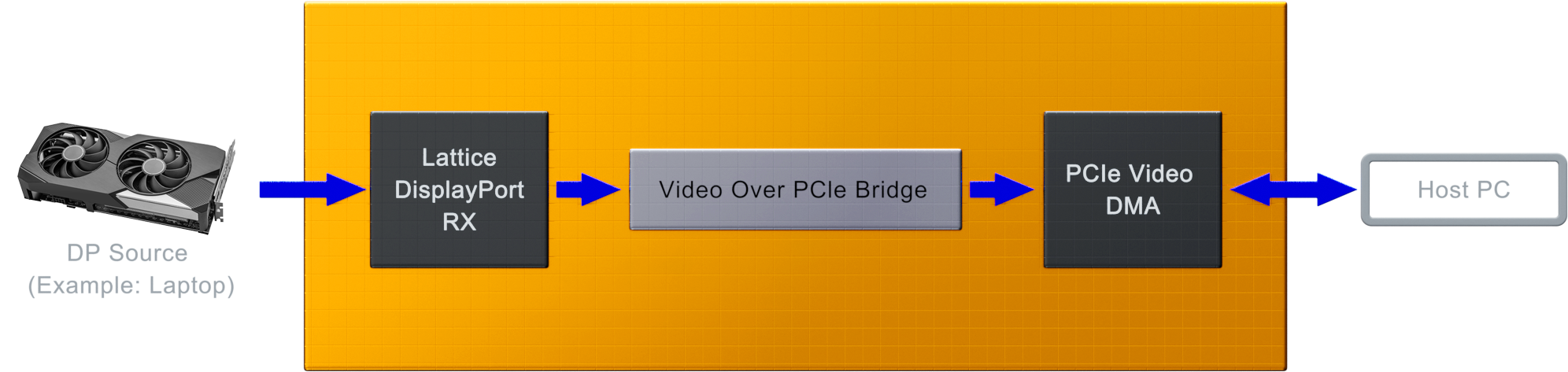 The CertusPro™-NX DisplayPort (DP) to Peripheral Component Interconnect Express (PCIe®) bridge design demonstrates the functionality of transferring DisplayPort video data to a computer through PCIe with a direct memory access (DMA) engine. This demo is based on the CertusPro-NX PCIe Bridge Board with Linux® operating system (OS) driver support that shows transfer of 4K60 video data to the computer memory. The board renders the data as video on the computer screen using the software driver.