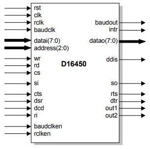 The core is perfect for applications, where the UART Core and microcontroller are clocked by the same clock signal and are implemented inside the same ASIC or FPGA chip, as well as for standalone implementation, where several UARTs are required to be implemented inside a single chip, and driven by some off-chip devices. Thanks to universal interface D16450 core implementation and verification are very simply, by eliminating a number of clock trees in complete system.
