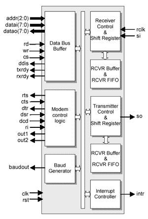 The D16550 is a soft Core of a Universal Asynchronous Receiver/Transmitter (UART) functionally identical to the TL16C550A. The D16550 allows serial transmission in two modes: UART mode and FIFO mode. In FIFO mode internal FIFOs are activated allowing 16 bytes (plus 3 bits of error data per byte in the RCVR FIFO) to be stored in both receive and transmit directions. D16550 performs serial-to-parallel conversion on data characters received from a peripheral device or a MODEM, and parallel-to-serial conversion on data characters received from the CPU.