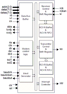 The core is perfect for applications, where the UART Core and microcontroller are clocked by the same clock signal and are implemented inside the same ASIC or FPGA chip, as well as for standalone implementation, where several UARTs are required to be implemented inside a single chip, and driven by some off-chip devices. Thanks to universal interface D16750 core implementation and verification are very simply, by eliminating a number of clock trees in complete system.
