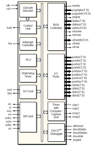 The DF6808 is a advanced 8-bit MCU IP Core with highly sophisticated, on chip peripheral capabilities. DF6808 soft core is binary-compatible with the industry standard 68HC08 8-bit microcontroller and can achieve a performance 45-100 million instructions per second. There are two configurations of DF6808: Harvard where data and program buses are separated, and von Neumann with common program and data bus DF6808 has FAST architecture that is 3.2 times faster compared to original implementation. Core in standard configuration has integrated on chip major peripheral function.