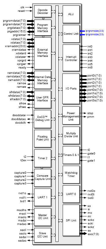 DP8051XP is a ultra high performance, speed optimized soft core of a single-chip 8-bit embedded controller dedicated for operation with fast (typically on-chip) and slow (offchip) memories. The core has been designed with a special concern about performance to power consumption ratio. This ratio is extended by an advanced power management unit PMU.