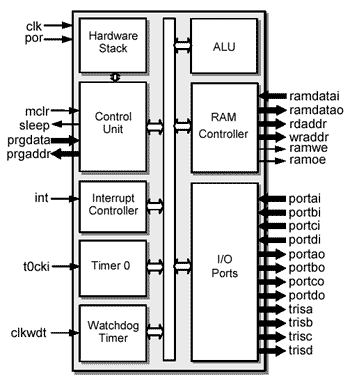 The DRPIC1655X is a low-cost, high performance, 8-bit, fully static soft IP Core, dedicated for operation with fast (typically on-chip) dual ported memory. The core has been designed with a special concern about low power consumption.