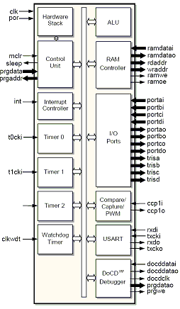 The DRPIC166X is a low-cost, high performance, 8-bit, fully static soft IP Core, dedicated for operation with fast (typically onchip) dual ported memory. The core has been designed with a special concern about low power consumption.