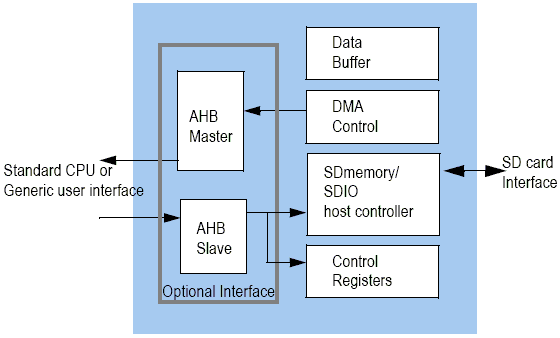 There are several options for user hardware interface to the controller core. The controller supports generic user interface optimized for on-chip logic interface as well as embedded CPU interface such as AMBA AHB bus. To access the SD card, the host CPU simply issue read/write access to the control registers in the core. The controllers core handles all the SD card protocol automatically including data shifting, timing and CRC generation. The core has a built-in DMA controller so that data can be automatically transferred between the system and the SD card without CPU intervention.