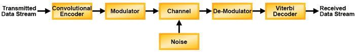 Convolutional encoding is a process of adding redundancy to a signal stream to provide error correction capability. The figure below shows a digital communication system using the Convolutional Encoder. The digital data stream (such as voice, image or any packetized data) is first convolutionally encoded, then modulated and finally transmitted through a channel.