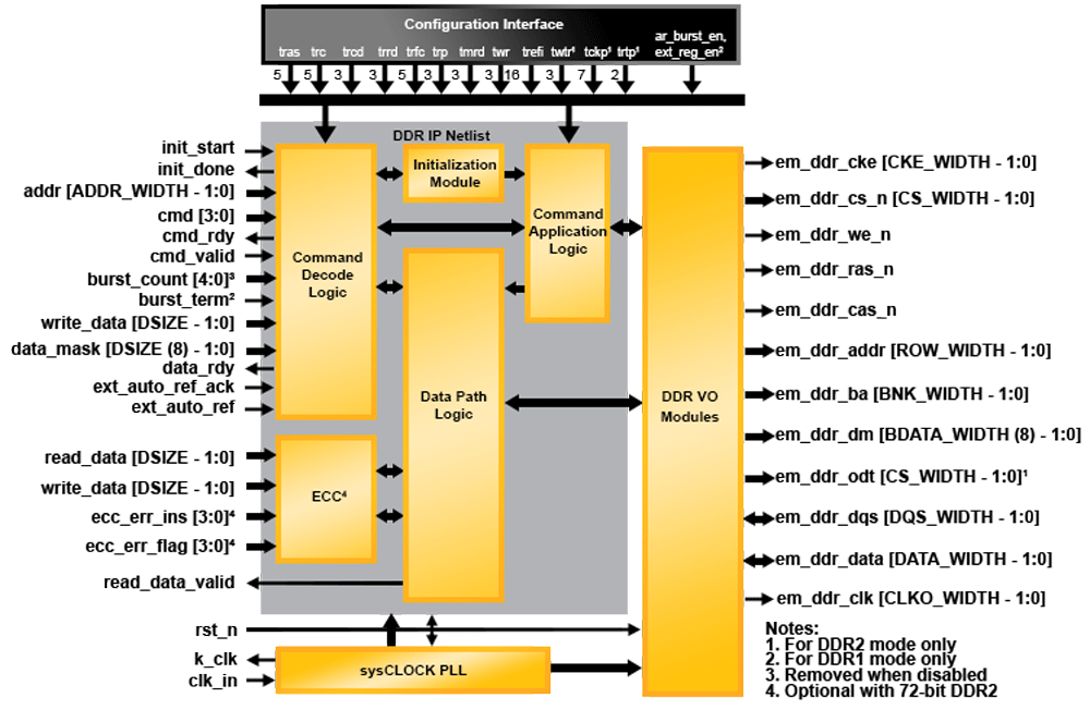 The Double Data Rate (DDR) Synchronous Dynamic Random Access Memory (SDRAM) Controller is a general-purpose memory controller that interfaces with industry standard DDR2 SDRAM. The memory controller provides a generic command interface to the user's application. This interface reduces the effort to integrate the module with the remainder of the application and minimizes the need to deal with the DDR2 SDRAM command interface. The timing parameters for the memory can be set through the signals that are input to the core as part of the configuration interface. This enables switching between different memory devices and modification of timing parameters to suit the application using the same netlist.