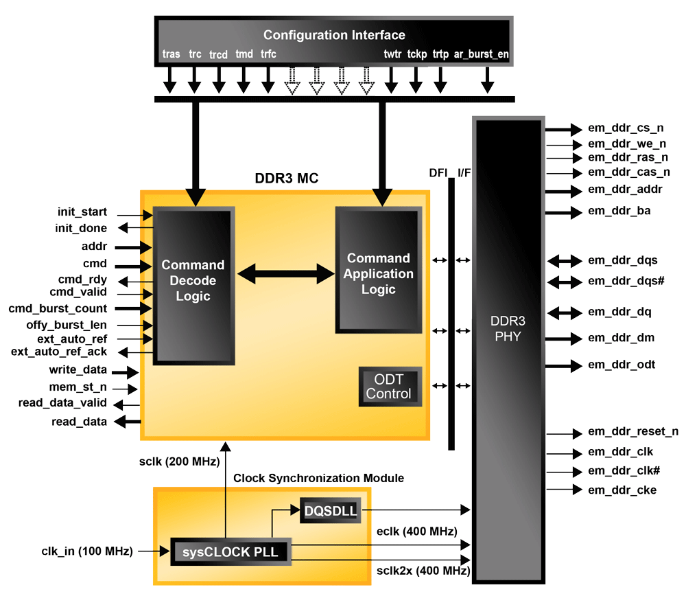 The Lattice Double Data Rate Synchronous Dynamic Random Access Memory (DDR3 SDRAM) Controller IP Core is a general-purpose memory controller that interfaces with industry standard DDR3 memory devices compliant with JESD79-3C, DDR3 SDRAM Standard. This IP provides a generic command interface to user applications.
