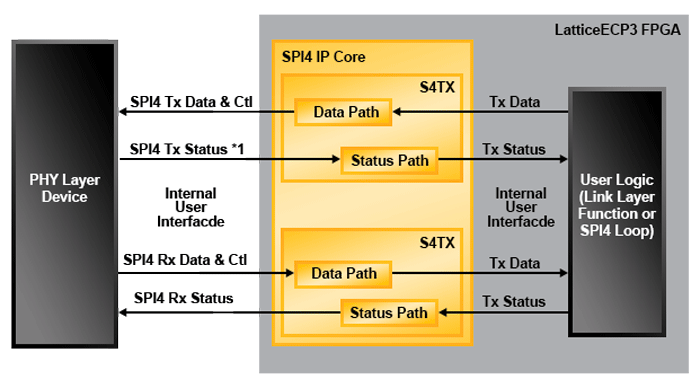 The SPI4 Intellectual Property (IP) core enables user instantiation of OIF-compliant System Packet Interface Level 4 Phase 2 Revision 1 (SPI4.2.1) cores in Lattice Field Programmable Gate Arrays (FPGAs). The SPI4 IP core supports up to 256 data channels with aggregate throughputs of between 3 and 12.8Gbps and can be used to connect network processors with OC192 framers, mappers, and fabrics, as well as Gigabit and 10-Gigabit Ethernet MACs.