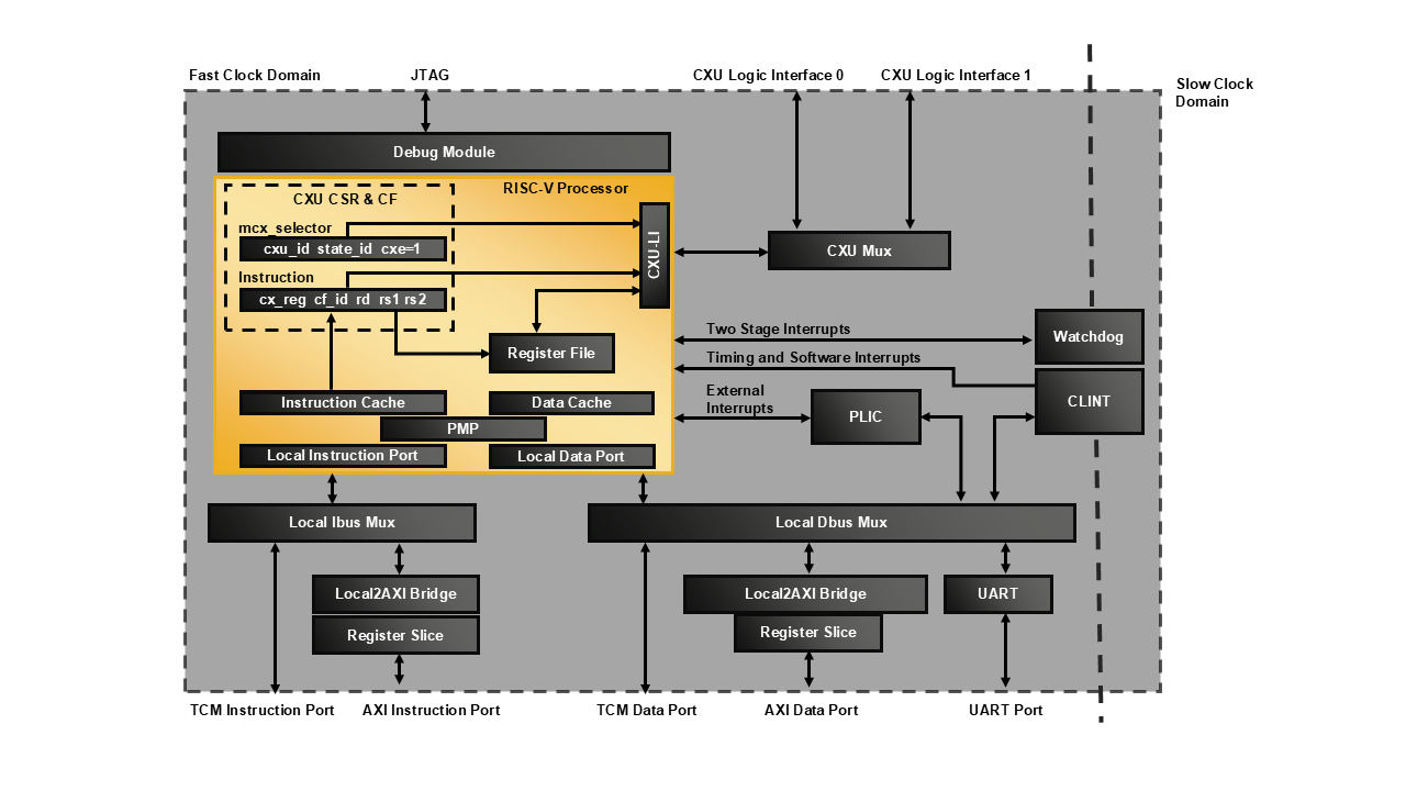 The Lattice Semiconductor RISC-V RX soft IP contains a 32-bit RISC-V processor core and several submodules – Platform Level Interrupt Controller (PLIC), Core Local Interrupter (CLINT), and Watchdog. The CPU core supports the RV32IMACF instruction set and the debug feature which is JTAG – IEEE 1149.1 compliant.