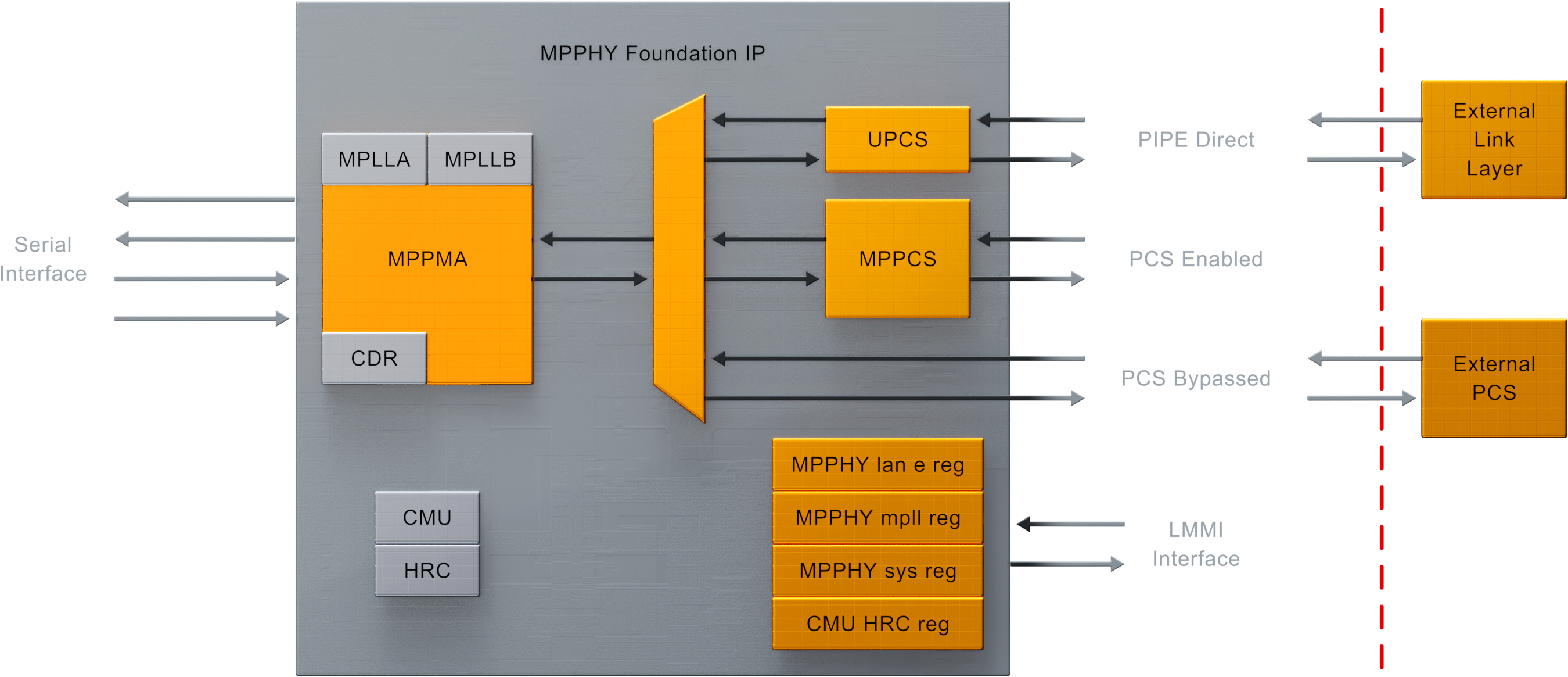 The Lattice Avant™ MPPHY Module supports the most common high-speed SERDES protocols user for inter-chip connectivity. It is implemented as a Quad-based (4-lane) SERDES which is the fundamental block of this IP.