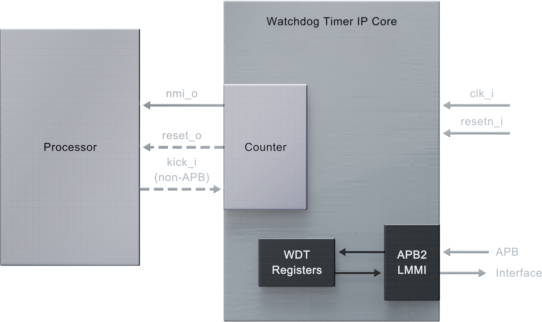 The Watchdog Timer IP is designed for use as an indicator that corrective action is needed in response to a computer or processor malfunction. The design features a two-stage timer that supports non-maskable interrupt and a hard reset. It is a two-stage timer that starts to count depending on the status of the processor.