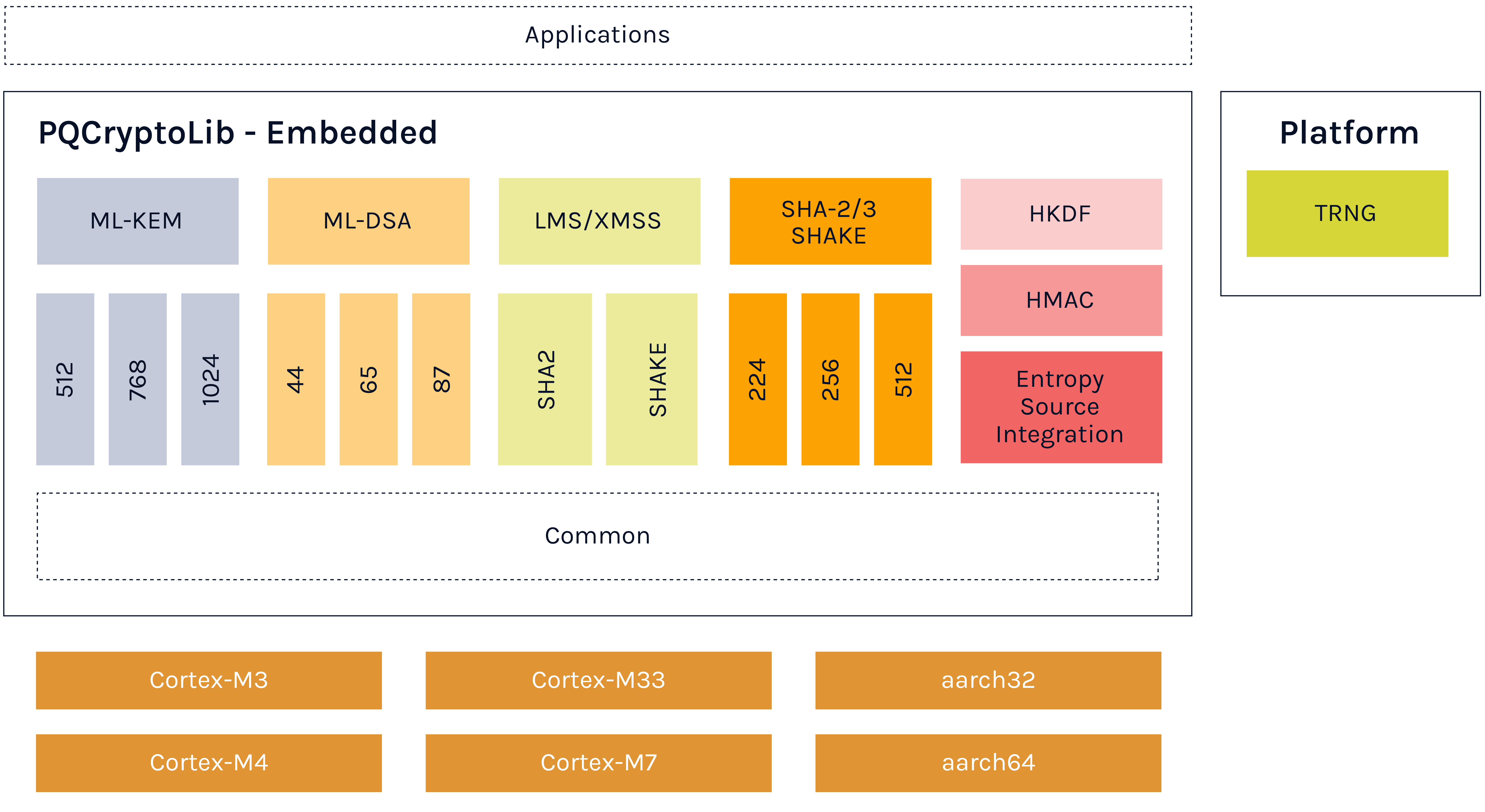FIPS 140-3 CAVP-compliant PQC solution for embedded systems, microcontrollers, and memory-constrained devices. PQCryptoLib-Embedded is focused on ultra-small solutions for PQC enablement of systems in the field or next generation devices.