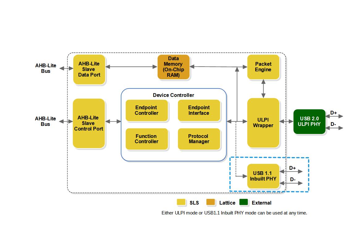 USB20SR IP Core is a device IP Core which can be fully controlled by firmware via AHB-Lite interface. It supports High Speed (480 Mbps), Full Speed (12 Mbps) and Low Speed (1.5 Mbps) modes.