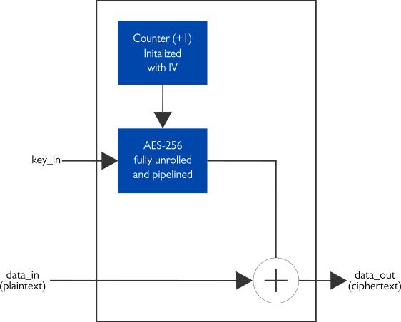 The high-speed AES256-CTR from Xiphera implements the Advanced Encryption Standard (AES) in Counter Mode (CTR). The Counter mode of operation effectively turns a block cipher into a stream cipher, and provides a number of advantages from an implementation point of view. These include the ability to use the same key expansion functionality and datapath for both encryption and decryption, and the possibility to parallelize the FPGA-based implementation by unrolling and pipelining.