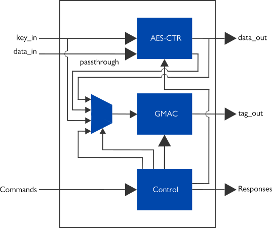 The high-throughput AES256-GCM from Xiphera implements the Advanced Encryption Standard (AES) in Galois Counter Mode (GCM). AES-GCM is a widely used cryptographic algorithm for Authenticated Enryption with Associated Data (AEAD) purposes, as it provides both data confidentiality and authenticity.