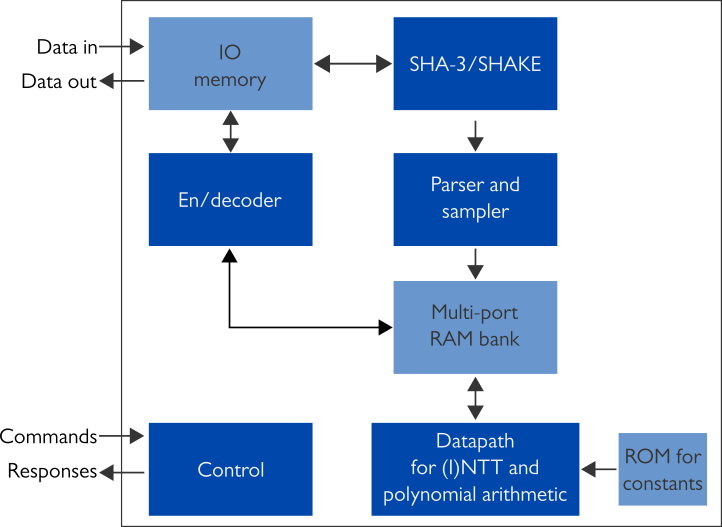 Secure Architecture: The execution time of the ML-KEM IP core is independent of the secret values and, consequently, provides full protection against timing-based side-channel attacks. The IP core has been implemented only in digital logic without any software components.
