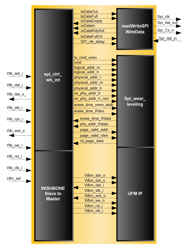 This reference design implements the wear leveling control of data storage for SPI Flash memory. The CPU stores the number of erases, logic-map-physical table, and the valid page pointers into Embedded Block RAM (EBR) or User Flash Memory (UFM) to keep track of the SPI Flash memory usage. A WISHBONE bus is used to interface between the master device and the wear leveling controller.