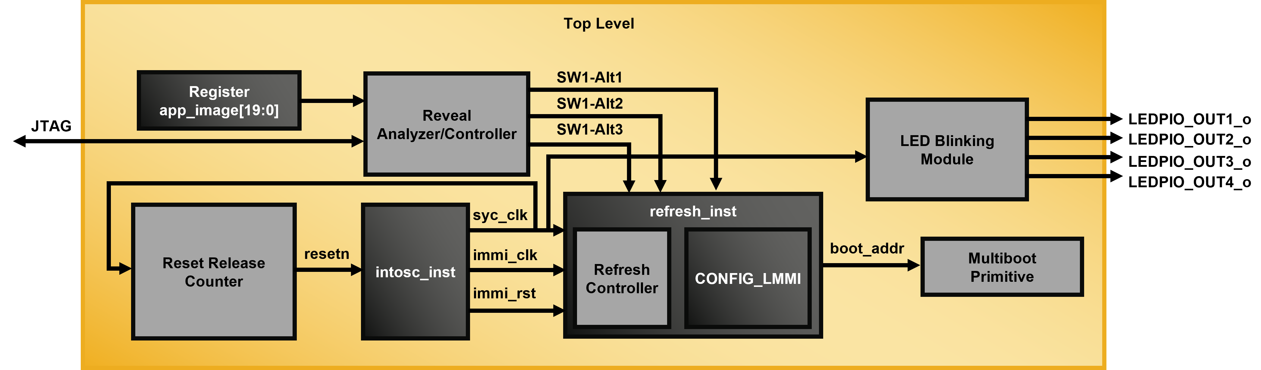 By using the MULTIBOOT primitive, it allows the device to operate in dynamic mode. It allows the system to dynamically switch to any of the alternate patterns after the device boots up from the primary pattern while still being protected by a golden pattern. This reference design implements the dynamic mode, which allows the system to dynamically switch between two to three bitstream patterns using the MULTIBOOT primitive. By using Multi-Boot mode, you can combine all the bitstream patterns into a single bitstream image and store it in a single external SPI flash device. This solution decreases cost, reduces board space, and simplifies field upgrades. Note that this reference design is developed using the CrossLink™-NX device, but the design can be ported to other Nexus devices.
