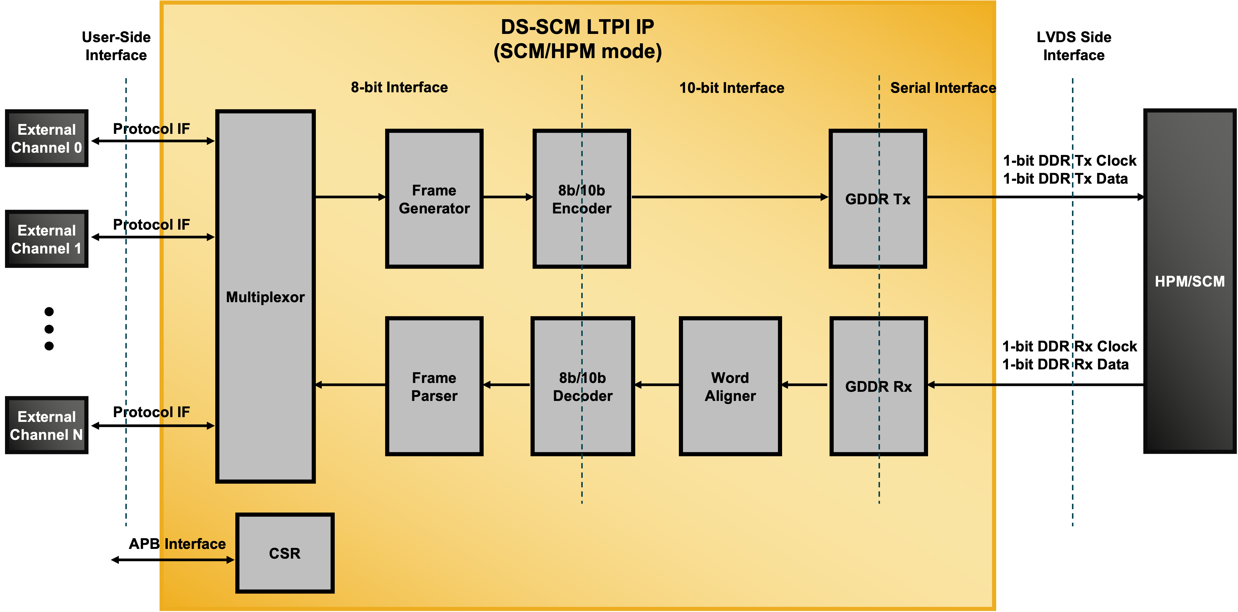 • Supports AMBA 3 APB Protocol version 1.0 for register access of the soft IP and data channel