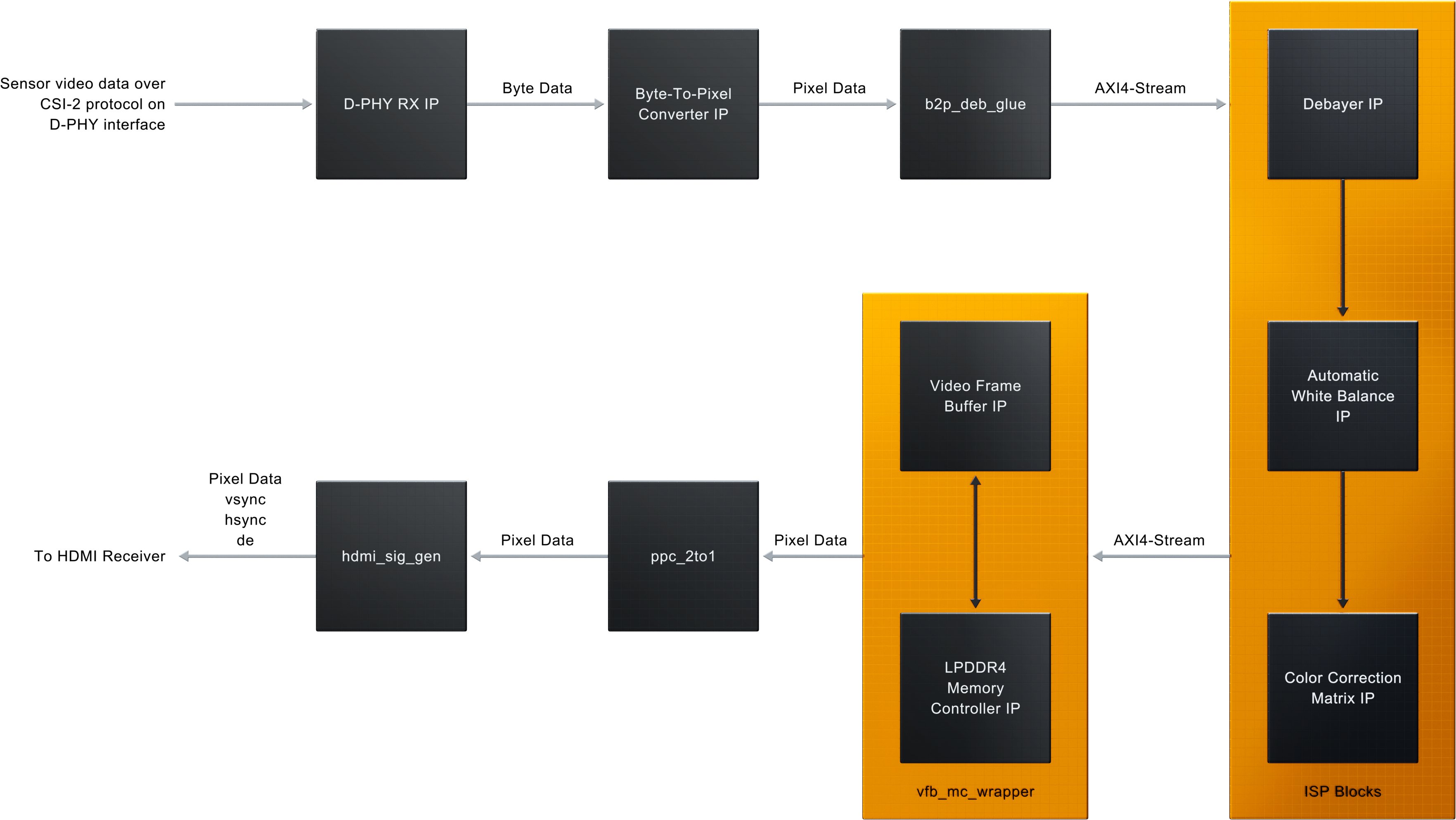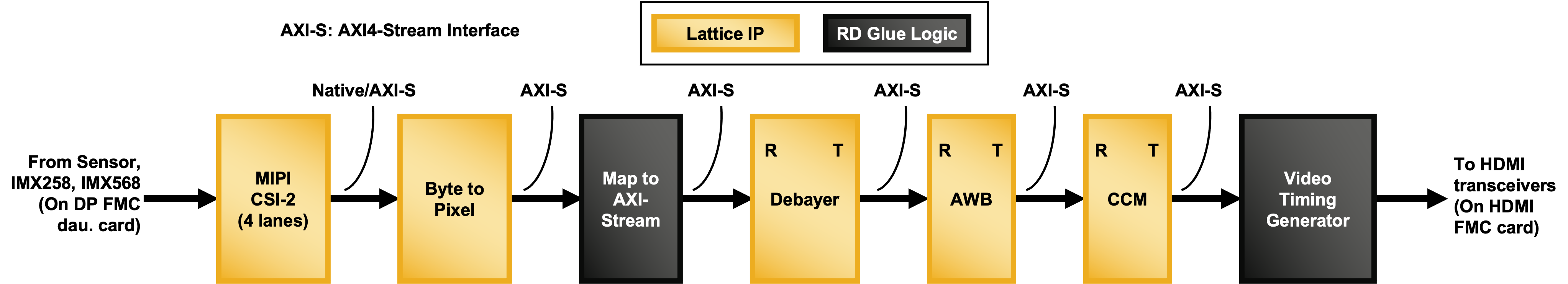 The Lattice CSI-2 to HDMI Reference Design for Lattice Avant™-AT showcases a full video path from a CSI-2 image sensor to HDMI output including sensor image processing in between the interfaces. The reference design uses a CSI-2 image sensor (IMX258) for sensing and Lattice CSI-2 D-PHY Receiver IP, and Lattice Byte-to-Pixel Converter IP to get the pixel data.