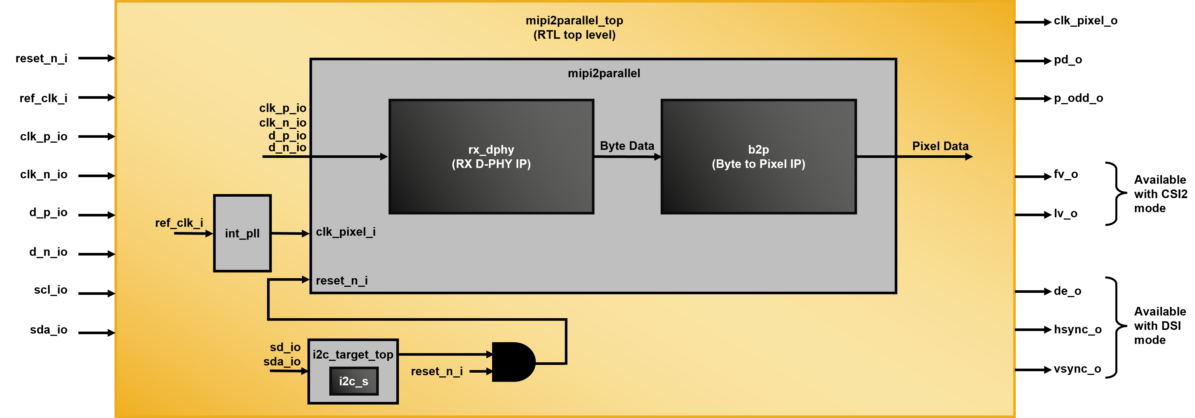 Support two primary clocks for the main video data path: byte clock and pixel clock – A GPLL is used to generate the pixel clock. The same GPLL can also be used to generate the continuous byte clock when the RX D-PHY is in non-continuous clock mode. The input to the GPLL is byte clock in continuous clock mode or ref clock in non-continuous clock mode.
