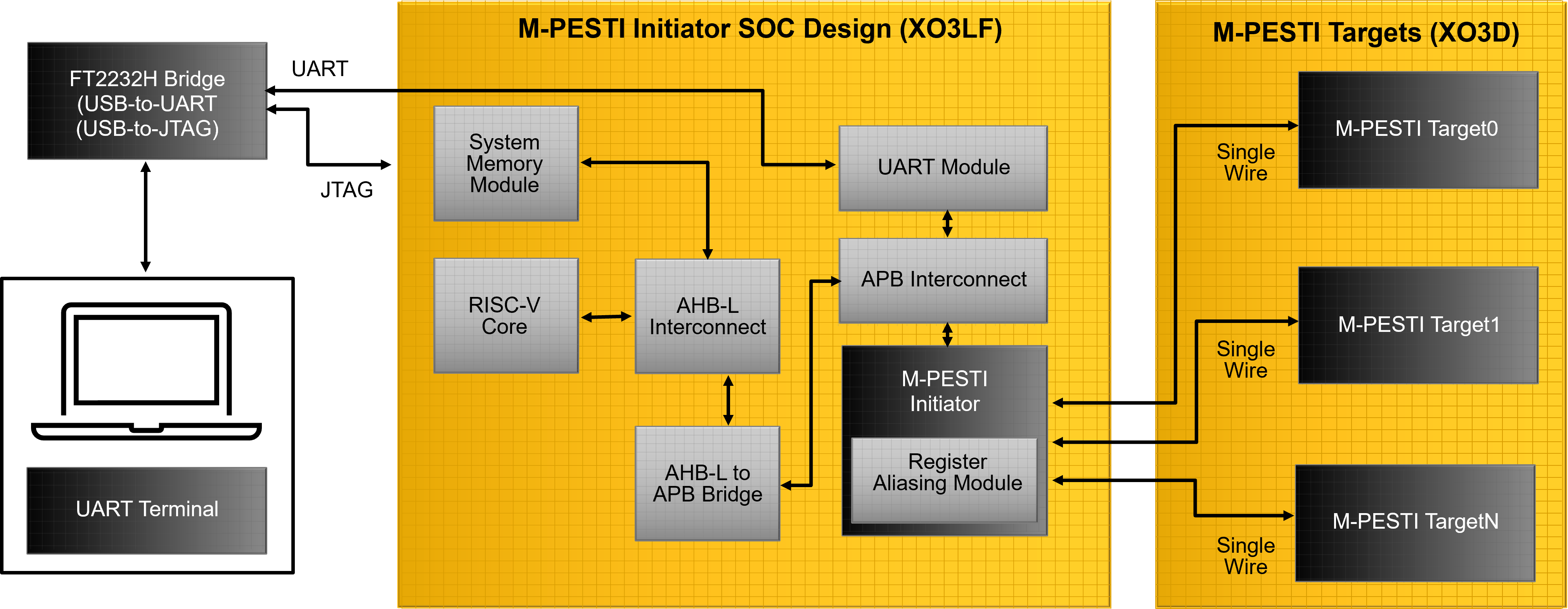 M-PESTI is a generic and extensible 1-wire, bidirectional circuit and protocol for applications such as cabled high-speed I/O interposers, managed power distribution, cooling systems, and other sensors. This reference design aims to provide M-PESTI as an SoC peripheral with a RISC-V core.
