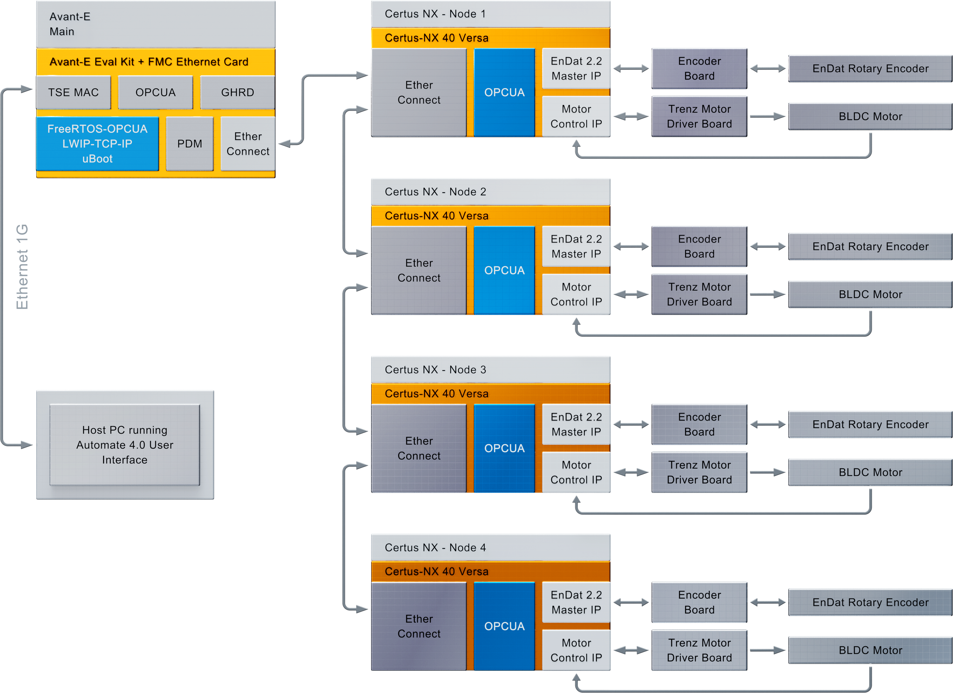 The Lattice Automate Stack solution system architecture and initial reference design is depicted below. The Lattice Propel built RISC-V processor based subsystem combined with HW acceleration enables flexible, low power and high performance support for multi-channel motor control with AI based predictive maintenance over EtherConnect - a low-cost, real-time embedded Ethernet Network. Lattice and design services partners are also available to provide customizations to enable support for different types of motors and topologies.