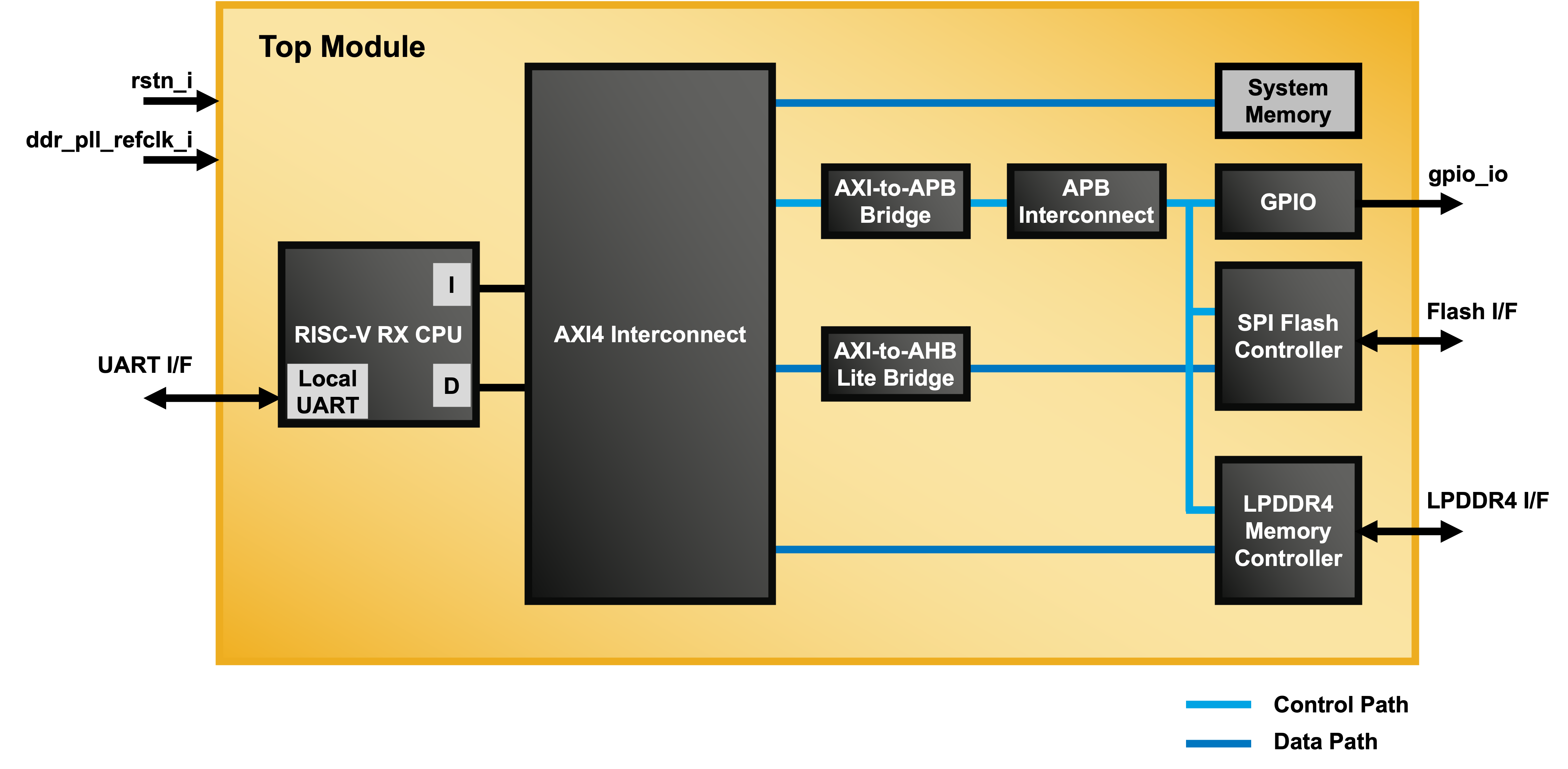 AXI4 Interconnect IP - Used to connect the RISC-V RX instruction and data AXI ports (managers) to various subordinates within the system. This includes the system memory, LPDDR4 memory controller, SPI flash controller, and peripherals. The interconnect output interfaces are AXI-based. As such, conversion bridges are used when connecting the AXI4 Interconnect to AHB-Lite or APB-based subordinates.