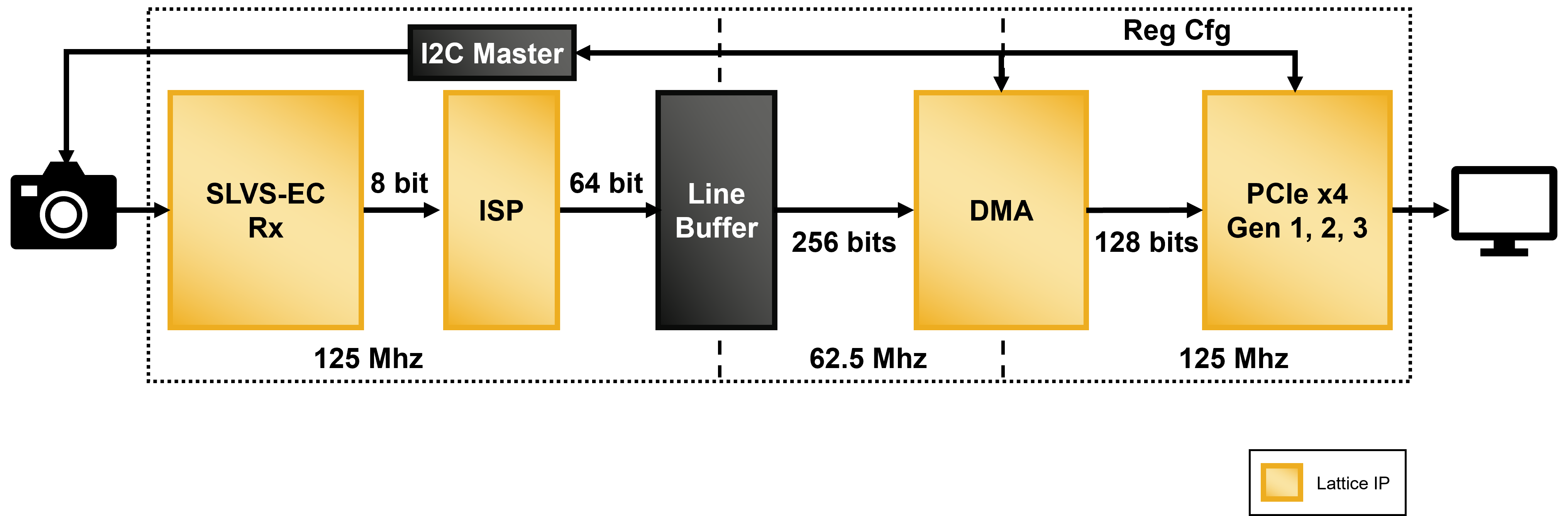 The SLVS-EC to PCIe reference design allows the quick interface to receive serial data from CMOS Image Sensors and convert the incoming serial data to DMA/PCIe Subsystem data format. The Lattice Semiconductor SLVS-EC to PCIe Interface reference design provides this conversion for Lattice Semiconductor CertusPro™-NX devices. This is useful for automotive, human-machine interfacing, and many other applications.