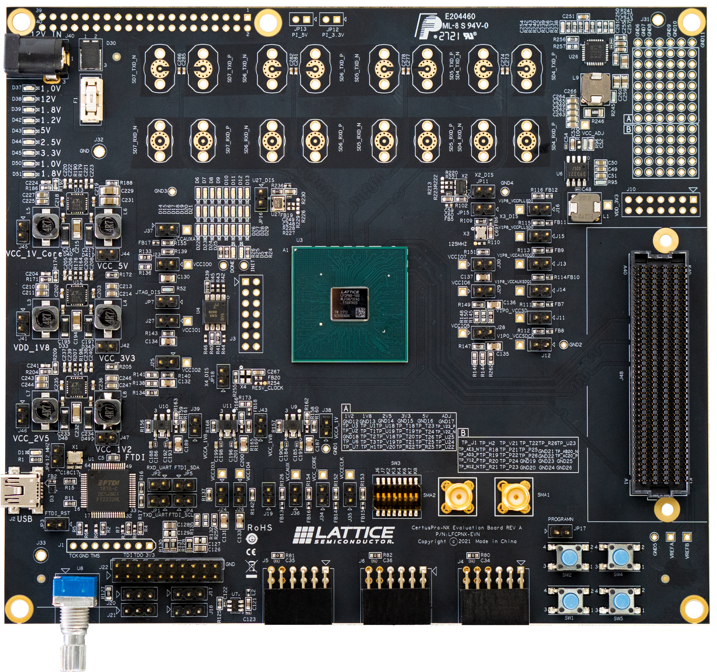 Easy access to I/O and SERDES – With 167 wide range I/O, 66 high-speed differential pair I/O, eight SERDES channels (capable of up to 10.3 Gbps) and 100K Logic Cells available for user-defined applications, the CertusPro-NX Evaluation Board allows designers to better investigate and experiment with the features of CertusPro-NX FPGA family.