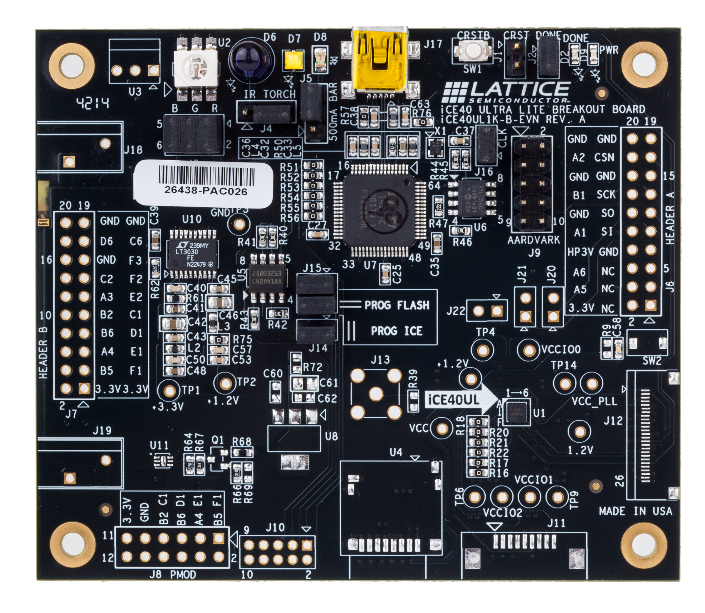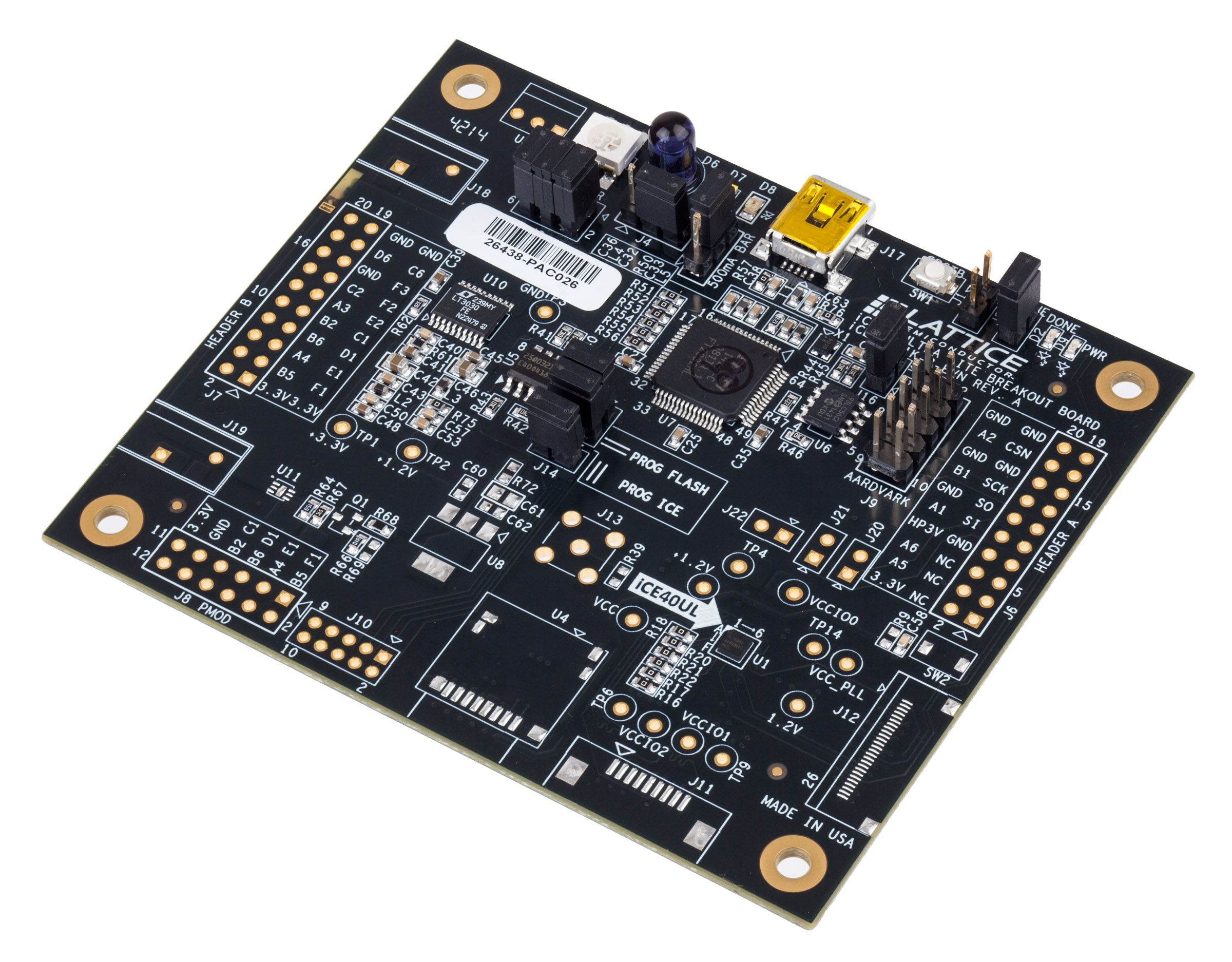 Easy-to-use, low cost breakout board for evaluation and development – Enables the broadest capability for development and uses the 36-ball BGA highest I/O package, high-density silicon iCE40UL1K.