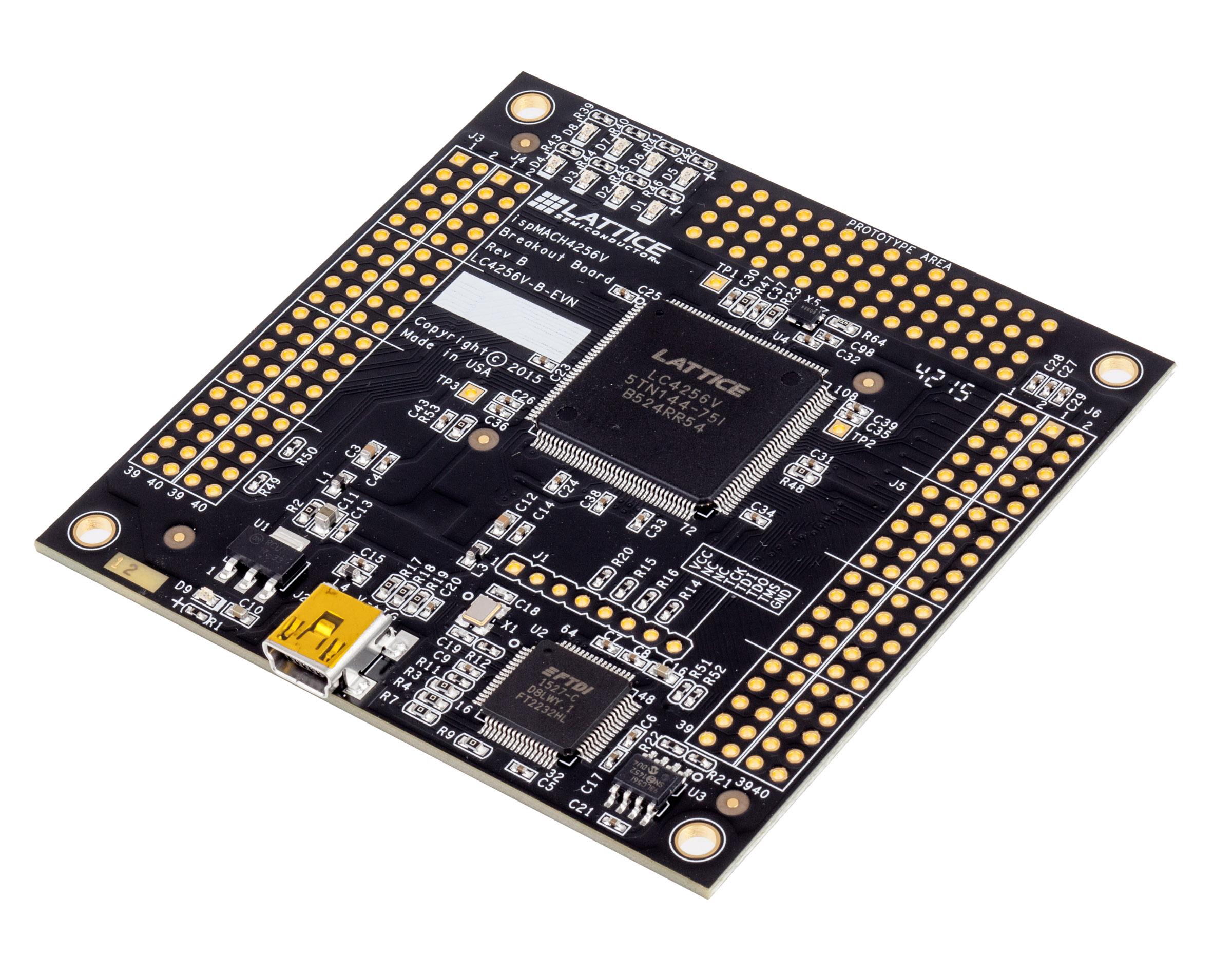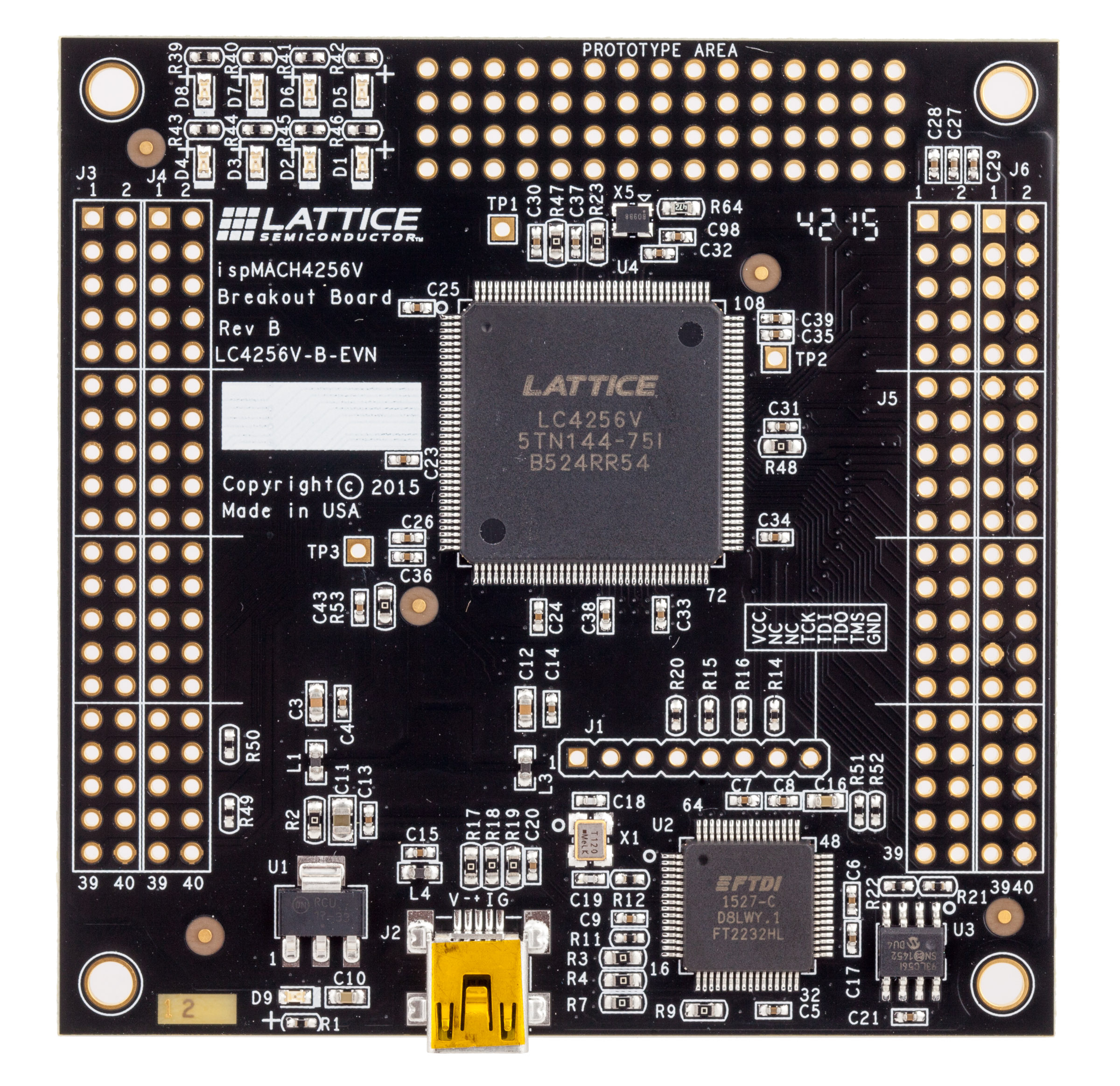 This board is a 3x3 inch form factor, and features a USB mini-B connector for power and programming, an LED array, and prototype area. A USB cable is included with the kit, and demos area available for download. By using free Lattice design tools, you can reprogram the ispMACH 4256V to review your own custom designs.
