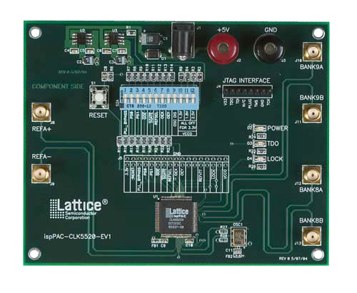 The ispClock Evaluation Board allows the designer to quickly configure and evaluate the ispClock5520 on a fully assembled printed-circuit board. The board features an ispPAC-CLK5520V-01T100C (20 outputs, 100-pin TQFP package), a header for user I/O, SMA connectors to selected high-speed I/O signals, LEDs for status indication, switches for added flexibility, and a JTAG interface for programming with the Lattice pDS4102-DL2A download cable (or Lattice flywire-based download cables).