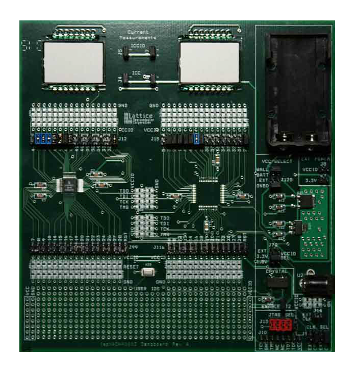 The ispMACH4064Z Evaluation Board is a complete hardware kit that allows the user to program, evaluate, and de-bug a design for the Lattice ispMACH4064Z device.