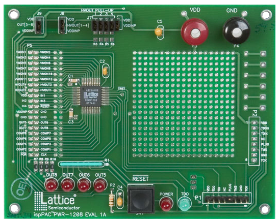 The PAC-POWR1208P1 evaluation board allows the designer to quickly configure and evaluate the ispPAC-POWR1208P1 on a fully assembled printed-circuit board. The double-sided board includes a 44-pin TQFP package, a header for user I/O, a JTAG programming cable connector, and an uncommitted pad array for user prototyping. JTAG programming signals can be generated by using an ispDOWNLOAD programming cable connected between the evaluation board and a PC. Both analog and digital features of the ispPAC-POWR1208P1 can be easily configured using PAC-Designer® software.