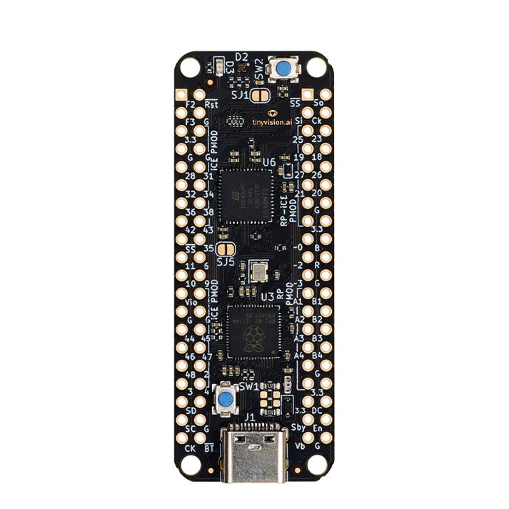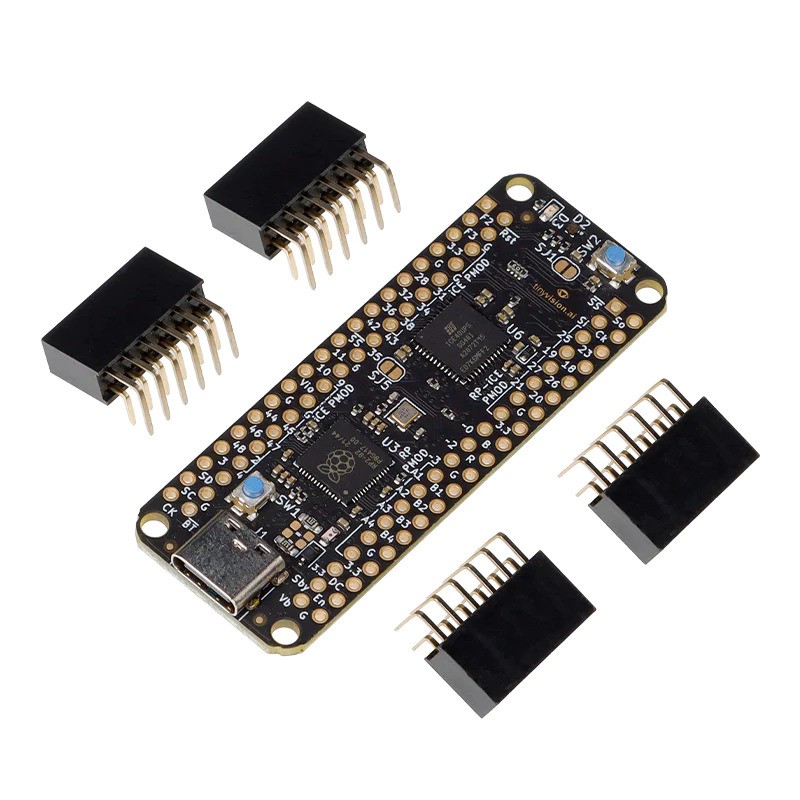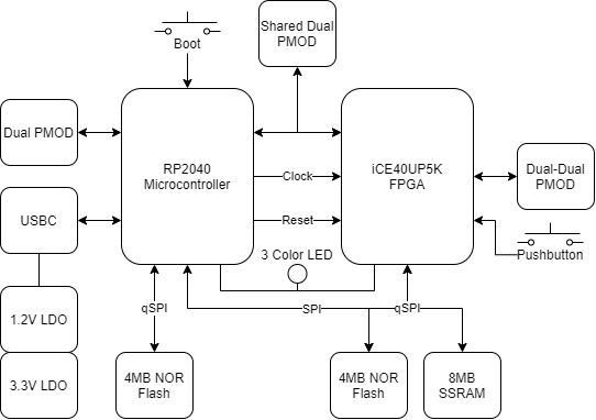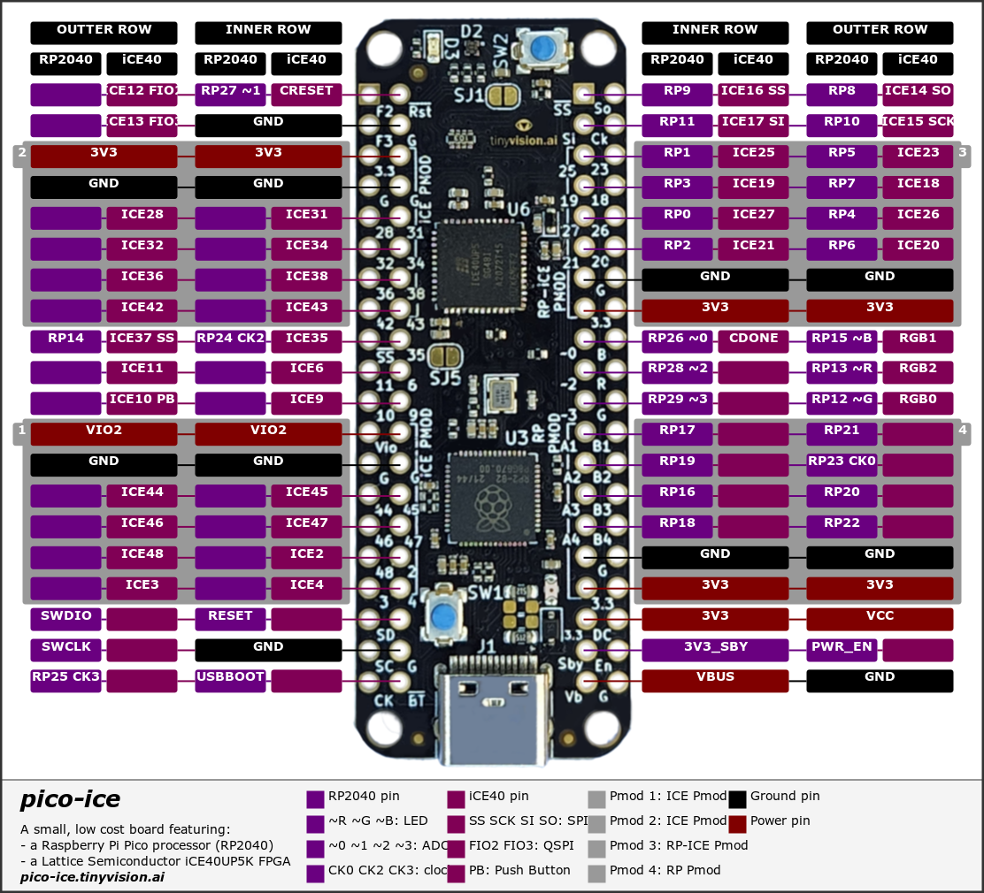 The Pico-Ice is a small, low-cost board with the Raspberry Pi Pico processor (RP2040) and a Lattice Semiconductor iCE40UP5K FPGA with 4 MB NOR flash, 8MB SSRAM, 3 color LED, pushbutton and 4 dual-PMOD headers bringing out all pins on the RP2040 and FPGA. Supported by Lattice Radiant and Icestorm software. OSHW certified.