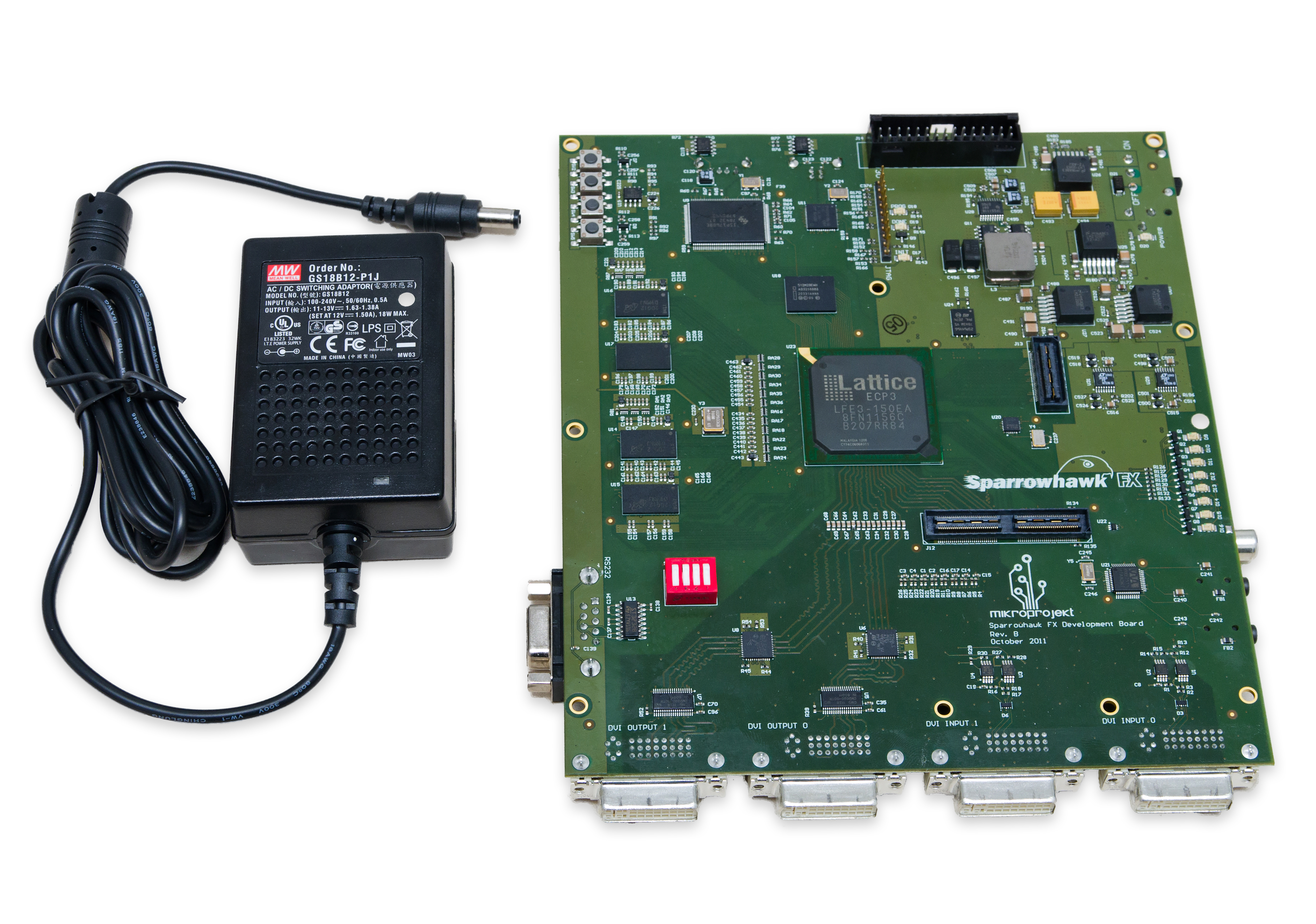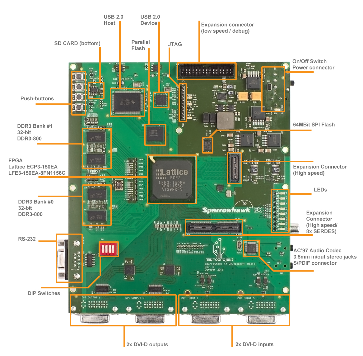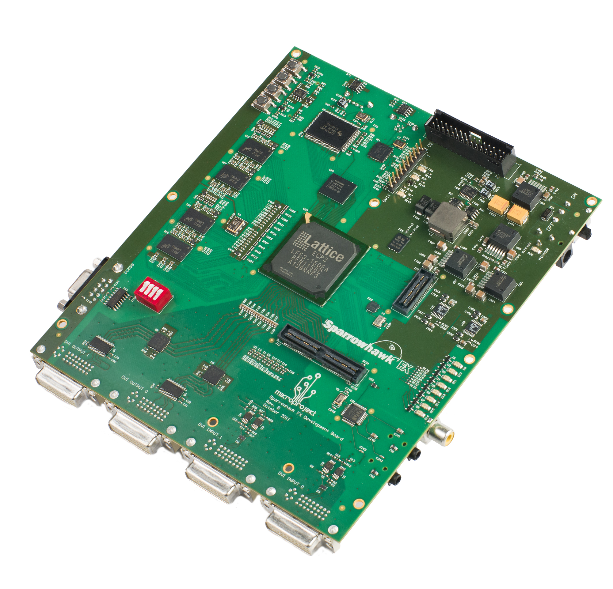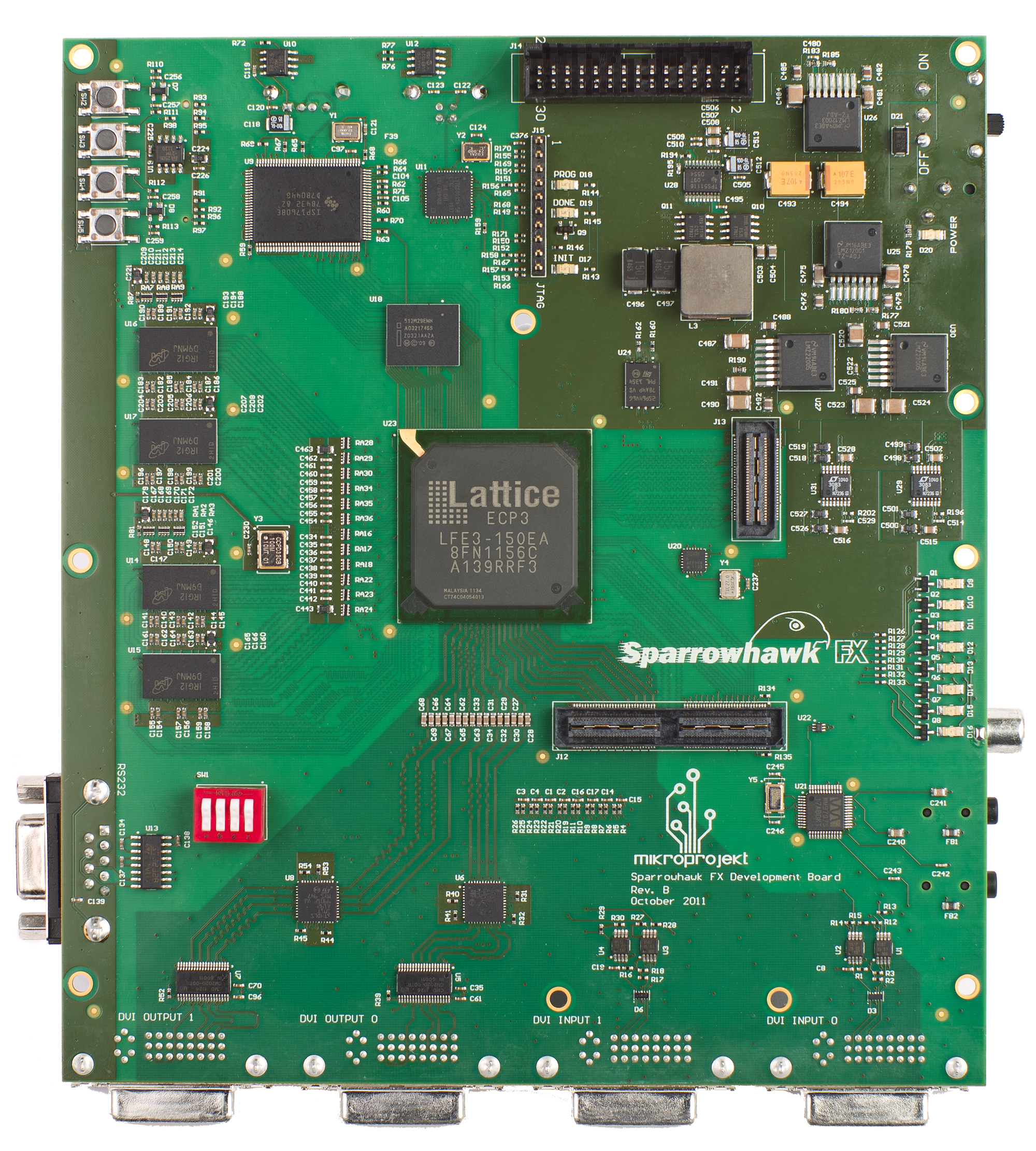 The Sparrowhawk FX board from Mikropojekt is an advanced FPGA development board targeted for video acquisition, processing, and display applications, based on the award-winning LatticeECP3 FPGA. The board is designed to support acquisition, processing, and output of multiple high definition video streams. Two banks of 32-bit DDR3-800 memory are provided to support frame buffering, delivering up to 6.4 GB/s in total - enough for 4 simultaneous 1080p60 video input and output streams over the onboard DVI-D or expansion connectors. The board integrates two input and two output DVI-D connectors (single link), with additional 8 SERDES input and output differential pairs available for expansion as DVI-D, SDI, or other video interfaces.