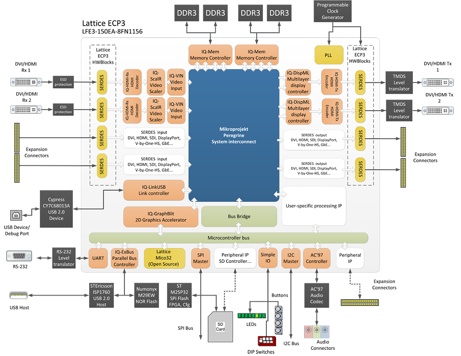 来自Mikropojekt的Sparrowhawk FX开发板采用屡获殊荣的LatticeECP3 FPGA,适用于视频获取、处理和显示应用。该开发板支持多路高清视频流的获取、处理和输出。两组32位DDR3-800存储器用于帧缓存,总速率高达6.4 GB/s——足够用于通过板上DVI-D或扩展连接器实现4路1080p60视频的同步输入和输出。该开发板集成2组输入和2组输出DVI-D连接器(单连接),以及用于扩展如DVI-D、SDI或其他视频接口的另外8个SERDES输入和输出差分对。